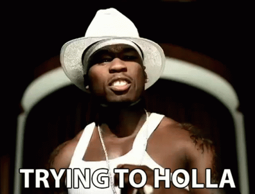 50 Cent in a white hat and tank top, singing 'Trying To Holla' from his music video 'Shoot Your Shot'.