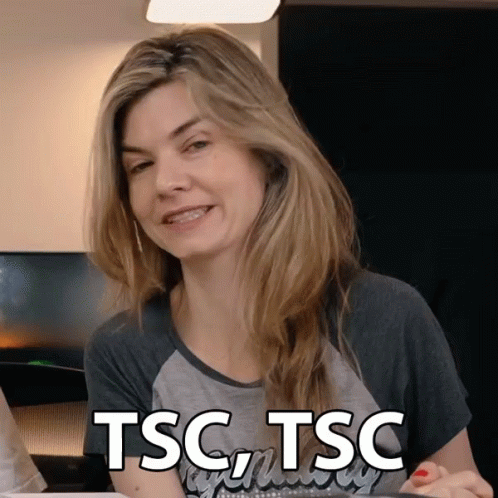 A woman wearing a grey and black raglan shirt with 'TSC, TSC' printed on it smiles with a knowing expression.