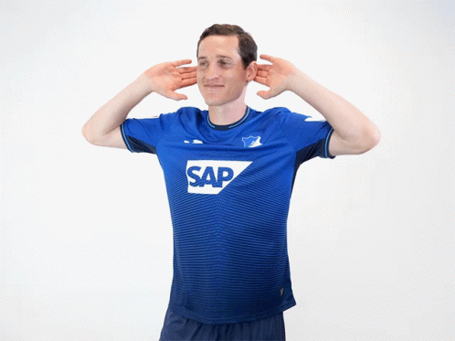 Sebastian Rudy, midfielder for TSG Hoffenheim, poses in his blue SAP-sponsored jersey with hands behind his head.