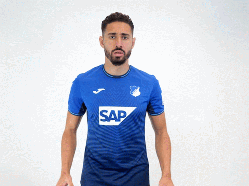 Ishak Belfodil, player for TSG 1899 Hoffenheim, cheering passionately in his blue SAP jersey.