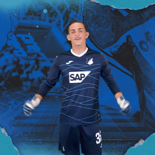 Nahuel Noll, the TSG Hoffenheim goalkeeper, smiles with arms outstretched, wearing his blue SAP-sponsored jersey.