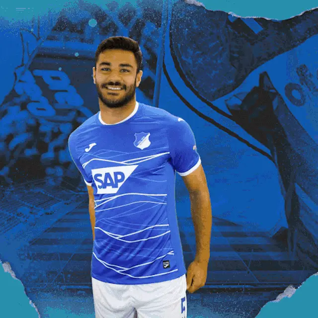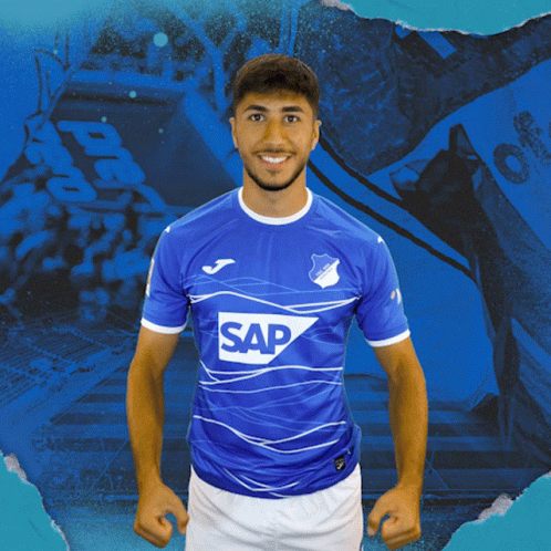 Muhammed Damar celebrates a goal for TSG Hoffenheim, showing his excitement in the blue jersey.