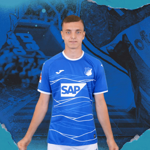 Fisnik Asllani, wearing his blue TSG Hoffenheim jersey with SAP logo, smiles and flexes his biceps.