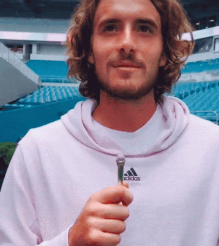 Stefanos Tsitsipas, the tennis player, wearing a pink Adidas hoodie and holding a microphone.