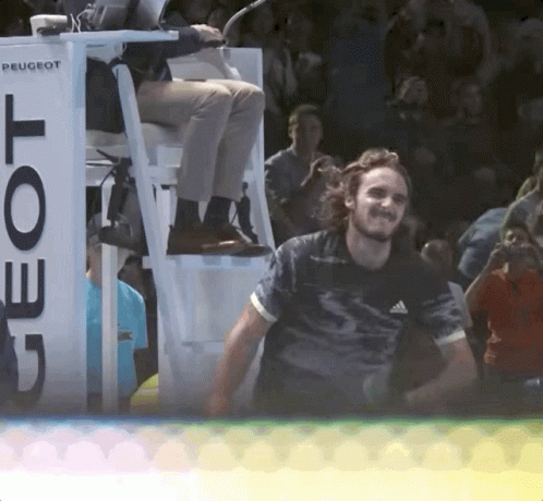 Tennis star Stefanos Tsitsipas celebrates a point or victory at the ATP Finals, pumping his fist with excitement.