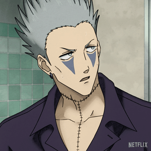 Tatsu from Sakamoto Days makes a 'tsk' expression, gritting his teeth and clicking his tongue.
