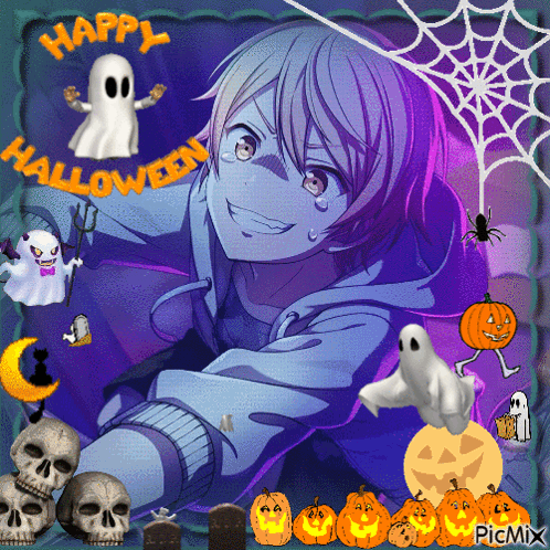 Tsukasa Tenma from Project Sekai celebrates Happy Halloween, surrounded by pumpkins, ghosts, and a spiderweb.