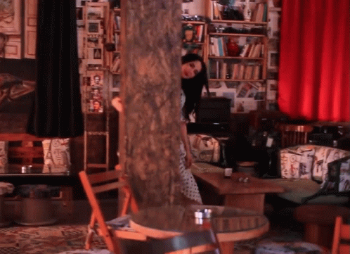 Yosra El Ferjani, also known as Ajit, appears from behind a wooden pillar in a cozy room with bookshelves.