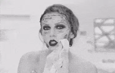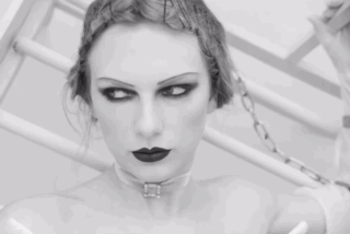 Taylor Swift in a striking black and white aesthetic, featuring dark makeup, braided hair, and a choker.