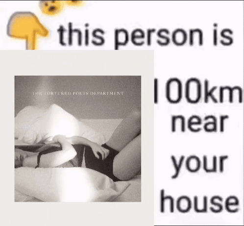A meme featuring Taylor Swift's 'The Tortured Poets Department' album cover with a decreasing 'km near your house' counter.