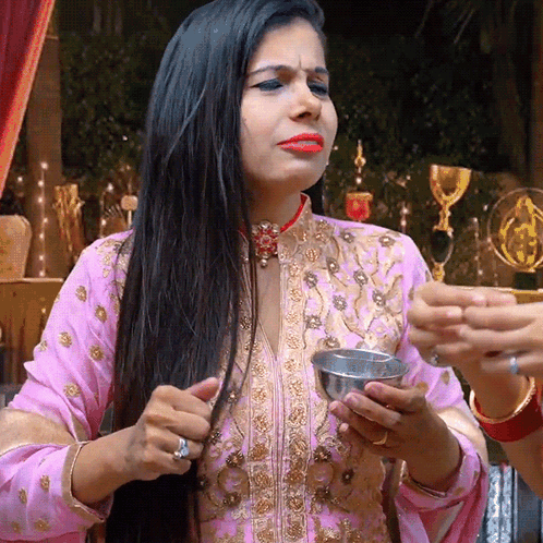 Sanjhalika Shokeen reacts with a 'Tu Bhi Na' expression while holding a silver bowl at an event.