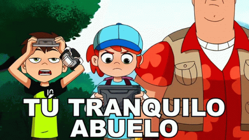 Gwen from Ben 10 animated series tells Grandpa Max to calm down, with Ben looking on. Caption: 'You be calm, Grandpa'.