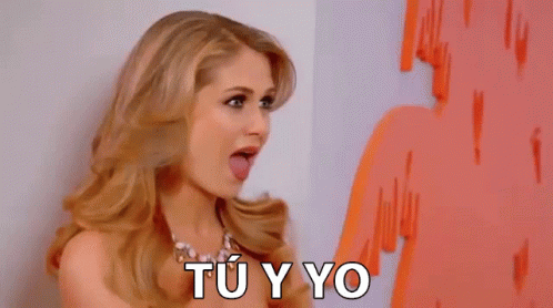 Ingrid Martz makes a funny face and points, with the text 'TÚ Y YO' displayed, conveying a playful message.