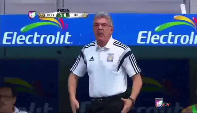 Tuca Ferretti, a man with a mustache, sits pensively on a bench in front of a Gatorade advertisement.