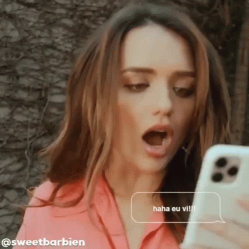 Rafaella Kalimann, also known as sweetbarbien, reacts to a message on her phone saying 'haha eu vi!!!'
