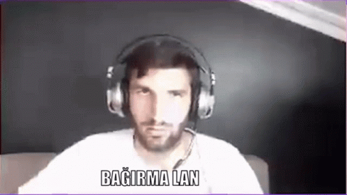 Hasanasa6 (Tulphas) with headphones and mic, looking at the camera. Features the text 'Bağırma Lan' (Don't shout, man!).
