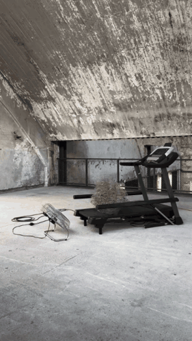 a treadmill sits in a room with a fan