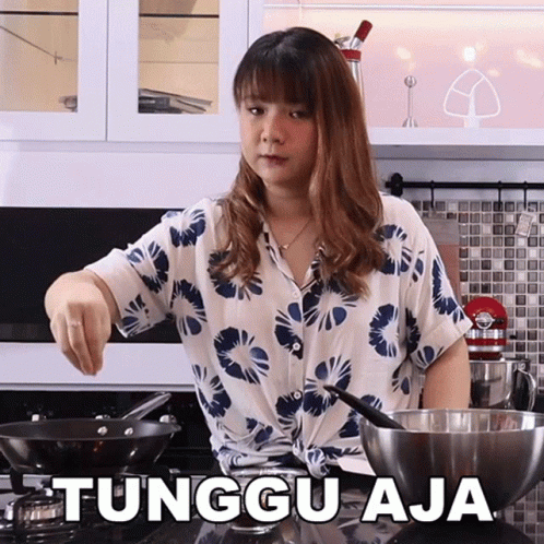 Clavania Kho cooking in a kitchen, with the text 'Tunggu Aja' (Just wait) displayed.
