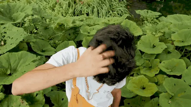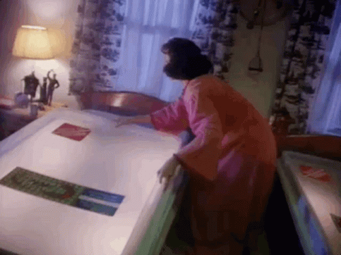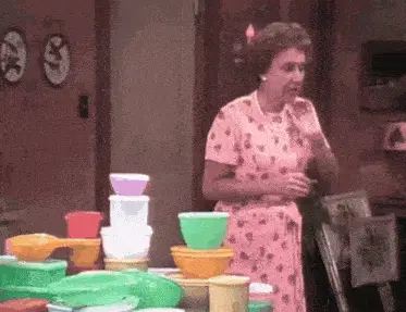 Woman in a pink robe interacting with a large, illuminated display, possibly related to Tupperware.