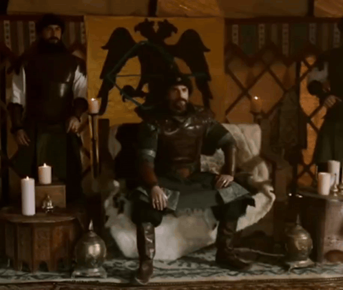 a man in armor sits in a chair with candles in front of him and a banner with a bird on it