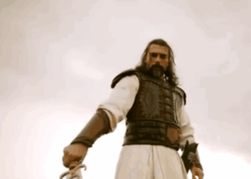 a man with a beard is standing in front of a cloudy sky with his arms outstretched