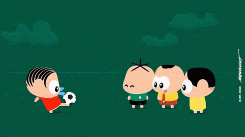 Monica, Cascao, and Cebolinha from Monica Toy play soccer in a cute animated scene.