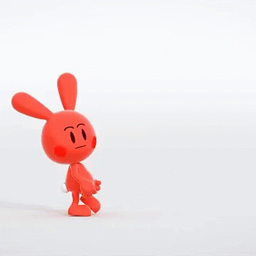 Turma Do Cueio, o coelho vermelho, caminha, se surpreende e acena alegremente.