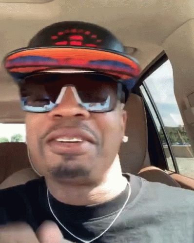 Plies, wearing stylish sunglasses and a hat, sits in a car and playfully turns the steering wheel.