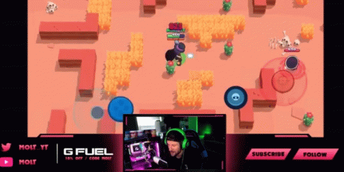 Molt plays Brawl Stars, showcasing random movements and turning around, with GFUEL branding visible on screen.