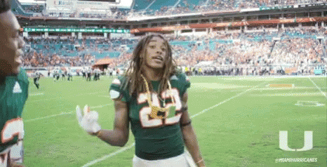 Football player celebrates with the iconic Miami Hurricanes Turnover Chain on the field.