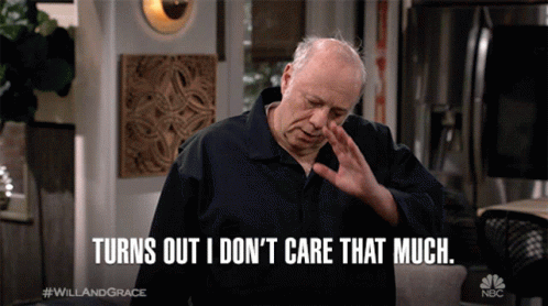 A man from Will & Grace delivers the line, 'Turns out I don't care that much,' with a dismissive gesture.