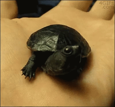 A small black turtle held in a person's hand opens its mouth wide as if yawning.