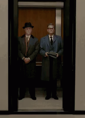 Two men in an elevator as the doors close, displaying the word 'TUTUP' (Close).
