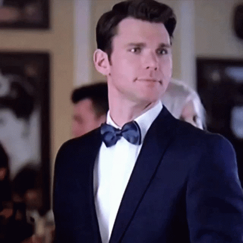 Kevin McGarry looking dapper in a navy tuxedo and bow tie at a formal event.