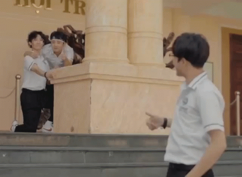Tuấn Anh and ÊNhỏLớp Trưởng with friends, giving a thumbs-up in a school setting.