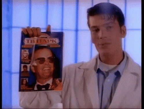 A man in a lab coat smiles while holding up a Russian 'Tv Park' magazine featuring Stanley Reynolds on the cover.