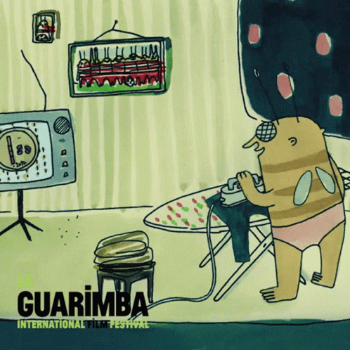Animated character ironing clothes while watching TV, promoting the Guarimba International Film Festival.