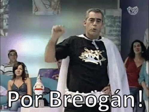 Carlos Blanco, dressed as a superhero, dramatically exclaims 'Por Breogán!' on Tvg Galego.