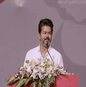Actor and politician Vijay smiling and clapping during his latest speech for Tvk Tamilaga Vettri Kazhagam.
