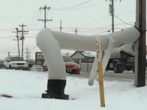 An inflatable air dancer appears to be 'twerking' in a snowy outdoor setting with cars and utility poles in the background.