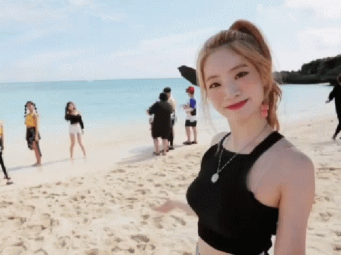 Twice's Dahyun playfully reacts on a sunny beach, enjoying the clear blue water with her group.