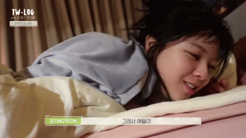 Jeongyeon from Twice on a 'Secret Friend' mission, reacting with surprise while lying in bed.