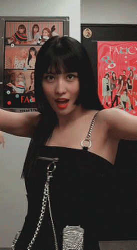 Twice's Momo, Hirai Momo, showcases playful dance moves in a black top, with K-pop posters in the background.