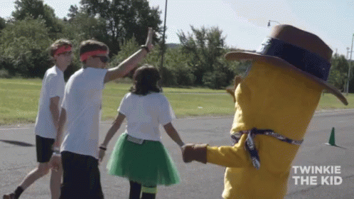 Twinkie the Kid mascot gives a high five to a person, celebrating with a cheerful 'YES!'