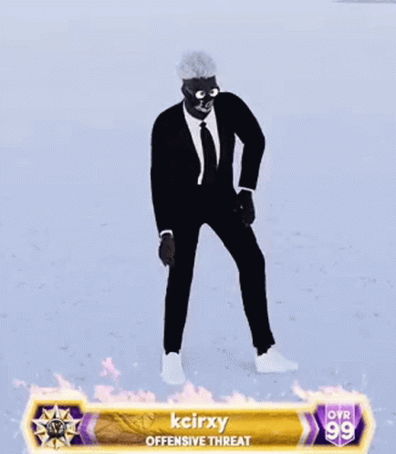 kcirxy, an Offensive Threat with OVR 99 in NBA2K, performs a stylish dance emote in a black suit.