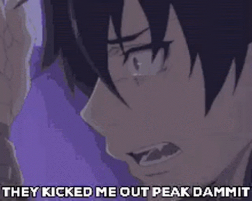 Anime character crying with the caption 'They kicked me out peak dammit', reflecting a meme about being excluded.