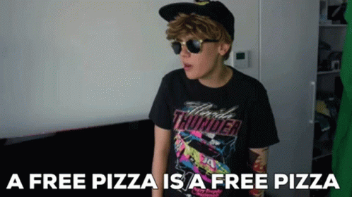 Cody, wearing sunglasses and a Florida Thunder shirt, states, 'A free pizza is a free pizza.'