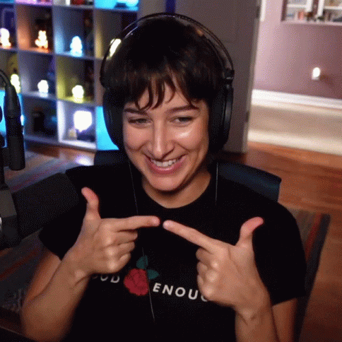 Alli Speed makes a shy two fingers touching gesture, smiling while wearing headphones and a 'GOOD ENOUGH' t-shirt.