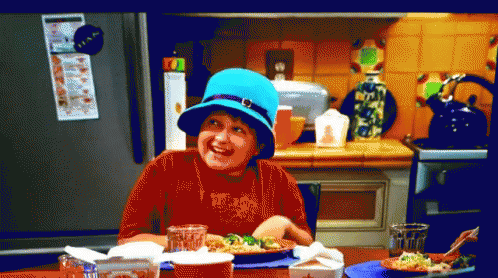 Jake Harper from Two and a Half Men, wearing a blue hat and laughing at a kitchen table with food.