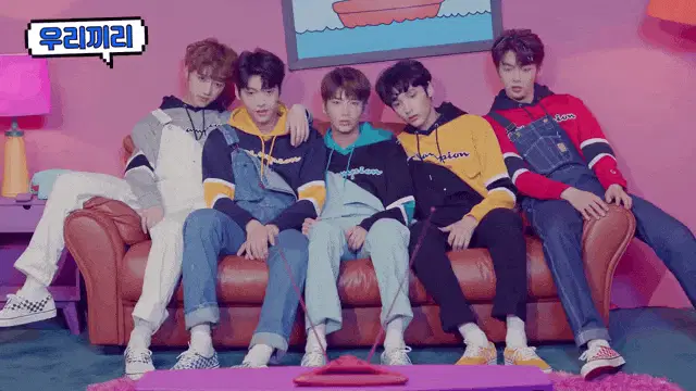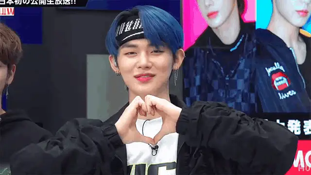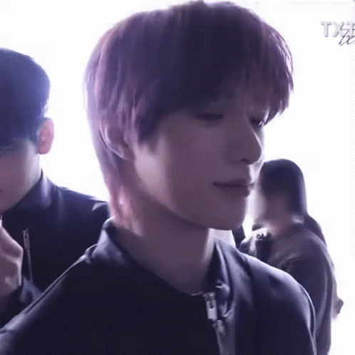 Txt member Beomgyu with purple hair, wearing a black jacket, smiling and looking at the camera.